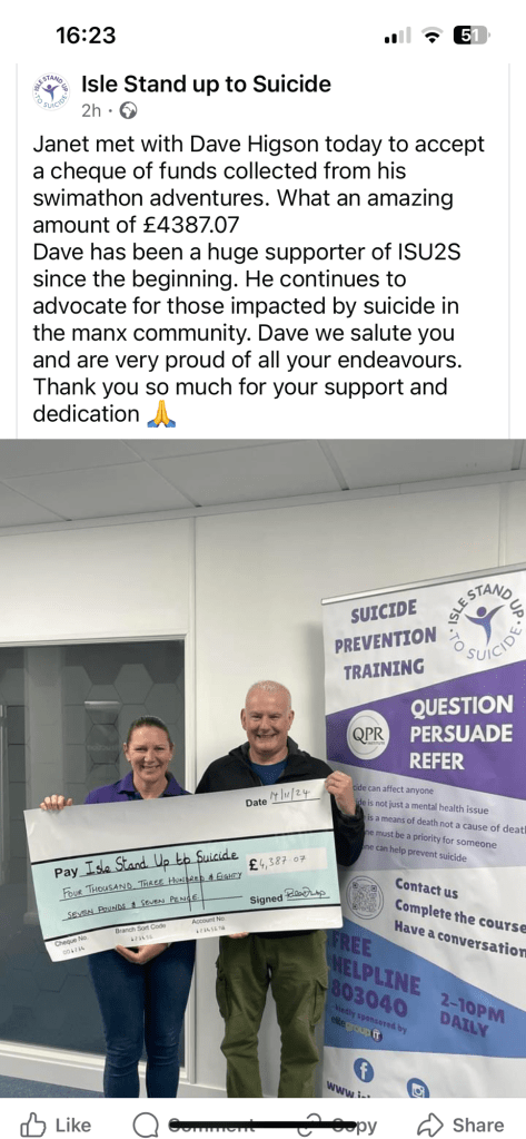 Cheque handover for Manx Adventure Swim Against Suicide Fundraiser.